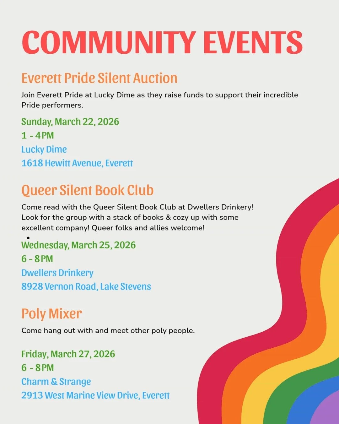 Whether it's a casual coffee chat, a weekend nature walk, or a seasonal celebration, Out in Snohomish events offer space for connection, visibility, and queer joy. Events are designed to be low-pressure and community-driven, with a focus on building relationships and making it easier to find your people right here in Snohomish.